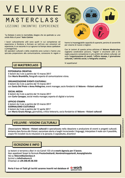 Con le Lezioni di questa prima edizione di Veluvre Masterclass vogliamo condividere percorsi, “regole” e strumenti utili a chi voglia acquisire competenze in più ambiti del settore culturale.